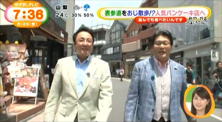 原宿を散歩する三宅キャスターと軽部アナウンサー。原宿ファッションよりも、食の方に興味があるとのこと。